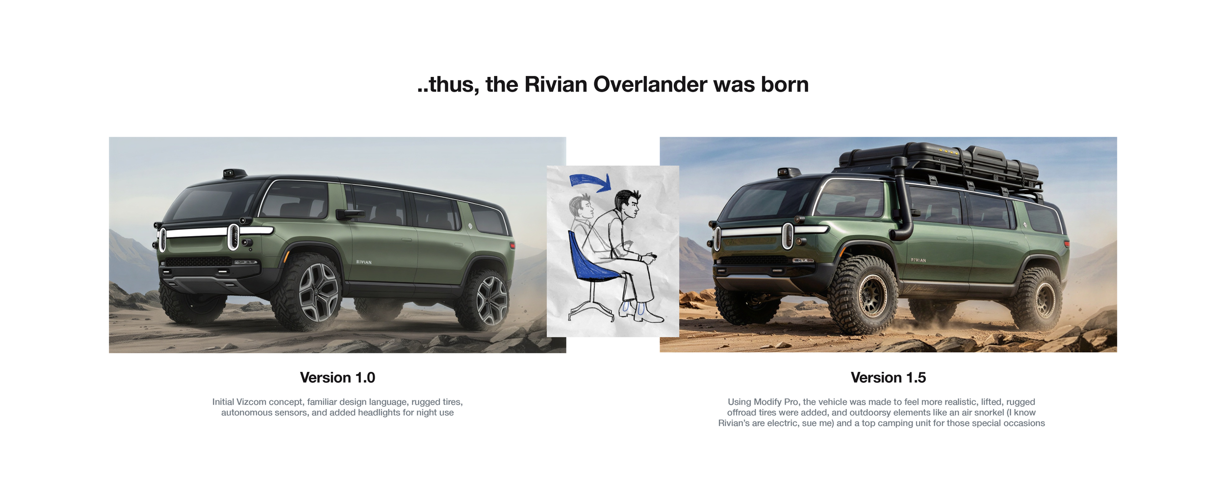 Taking an old collegiate studio project and reimagining it through the lens of new age tools and processes using one of my favorite brands, Rivian. Built using Adobe Photoshop, Vizcom, Blender, and Adobe Premiere Pro